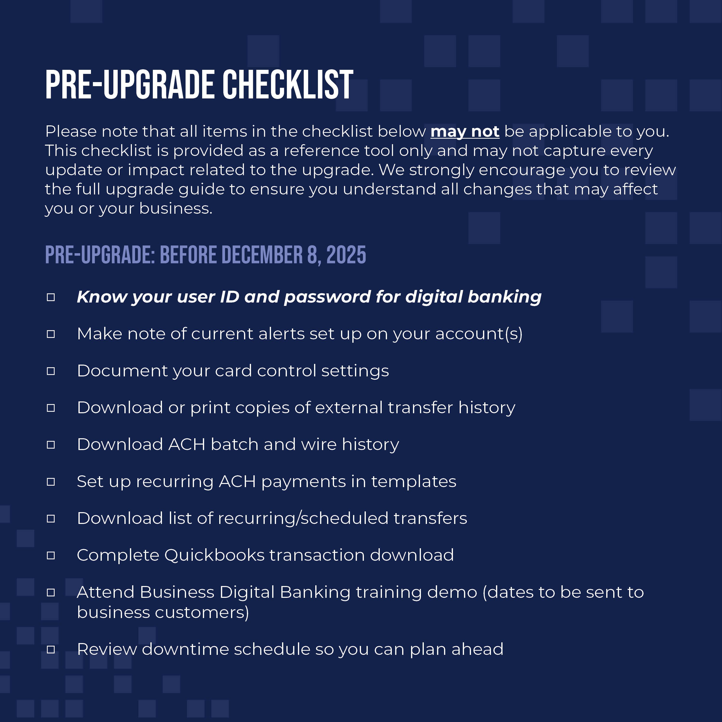 - Review Your Settings & Alerts: Certain settings may need to be re-enabled after the upgrade including alerts, card controls and transfers. To save time, make a note of your current alerts and/or save a copy of your transfer history for your records before December 8th.