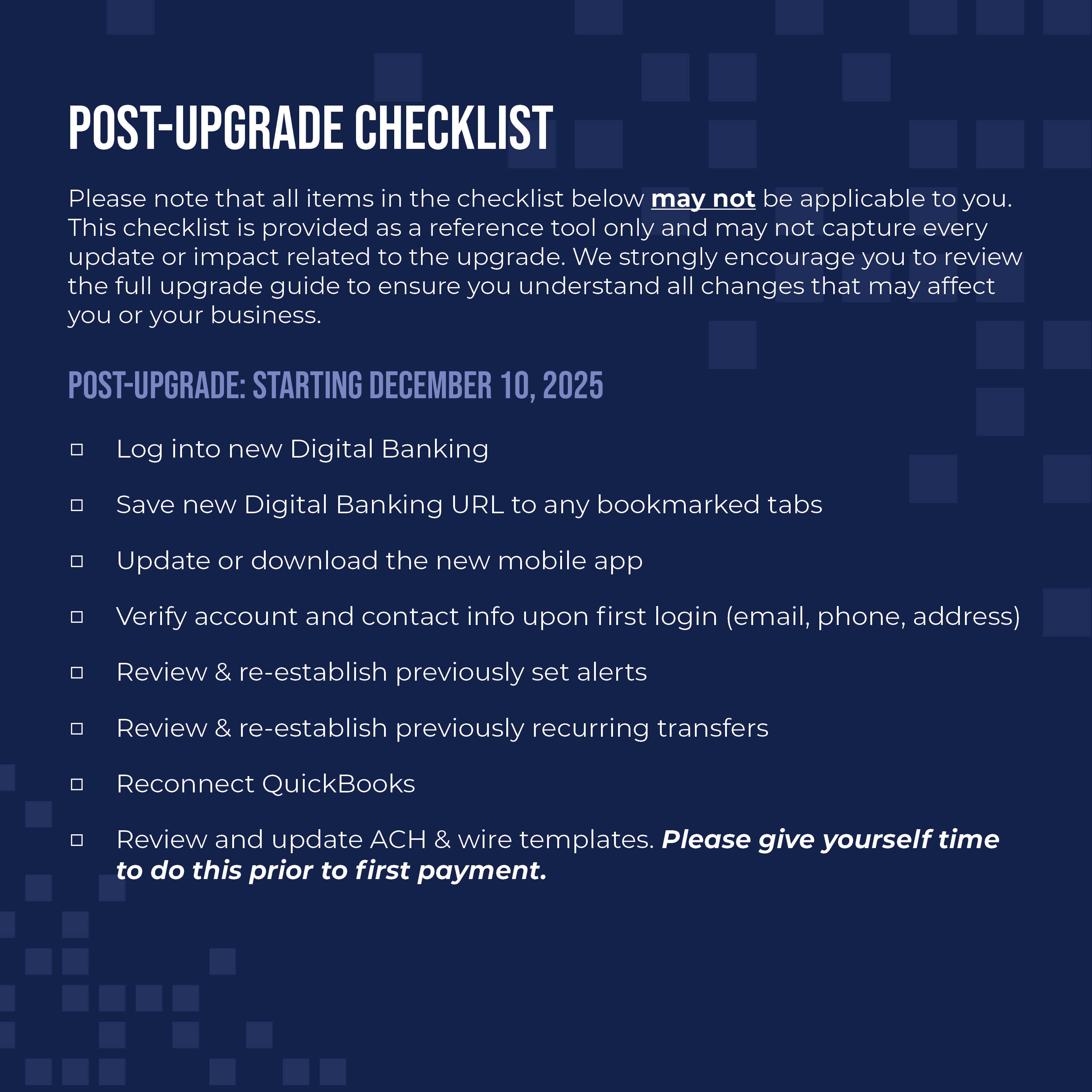 - External Transfers and Alerts: External transfers and alerts may not carry over to the new system. Please remember to review or re-establish them upon first login.